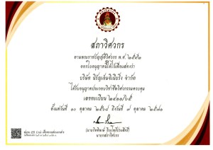 ได้รับใบอนุญาตประกอบวิชาชีพวิศวกรรมควบคุม เลขทะเบียน 2411/65 จากสภาวิศวกร